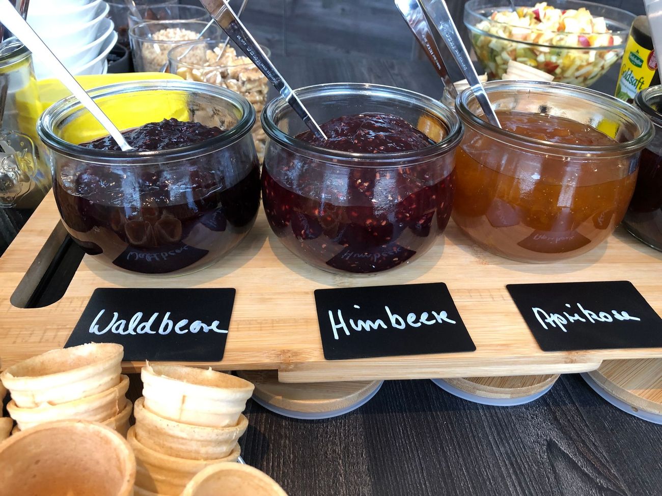 mit Honig, Fruchtaufstrich, Wurst- und Käsevariationen, frischer Rohkost, Rührei, gekochtem Ei, Speck, Würstchen, geräuchertem Lachs, Grillgemüse, Müsli, Joghurts, frischem Obst & mehr.